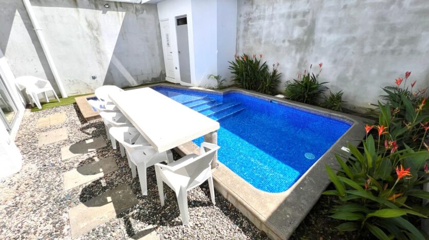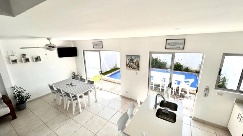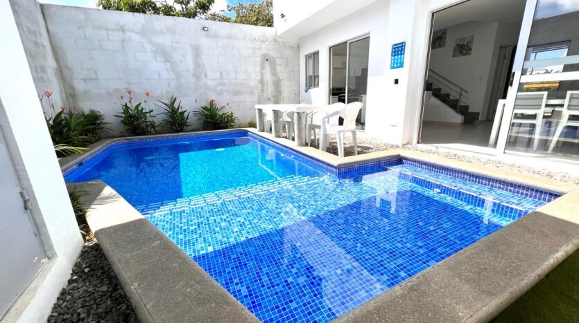 Ahora déjeme contarle de esta propiedad, es nueva recién construida, pensada para que usted y su familia descansen confortablemente: es de dos plantas, tres dormitorios dos baños completos, piscina, cuarto de lavado y parqueo para tres carros. Está totalmente amoblada, la piscina está ubicada en la parte trasera de la casa. Si lo que busca es una segunda casa y/o una propiedad para invertir con un muy rápido retorno de inversión esta es su oportunidad no la deje pasar, haga una cita y vamos para mostrarle su futura inversión.