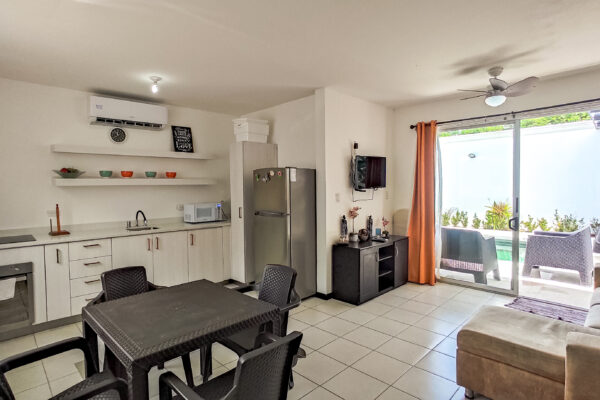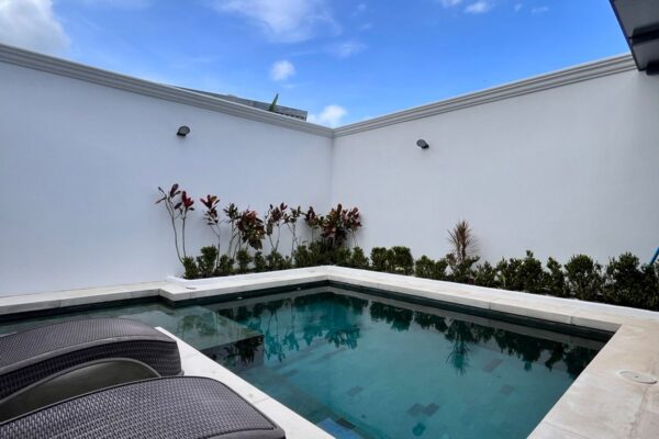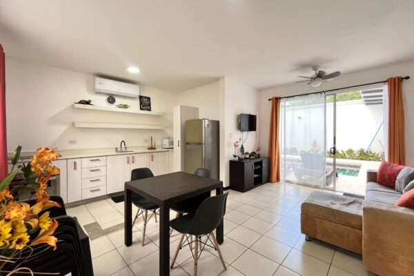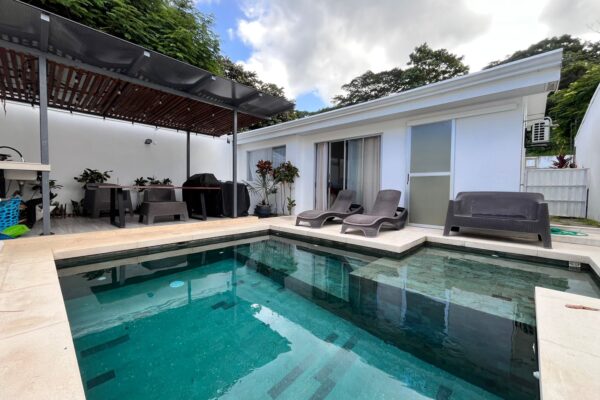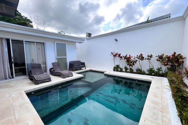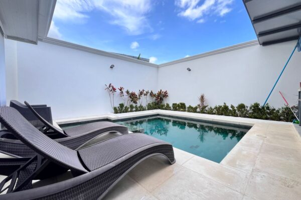 The home features 2 bedrooms, 2 full bathrooms, a fully equipped kitchen, integrated living and dining area, and a private terrace perfect for enjoying the tropical climate. Its standout feature is the modern private saltwater pool with natural stone finishes—an elegant space designed for both relaxation and entertainment in a secure environment.