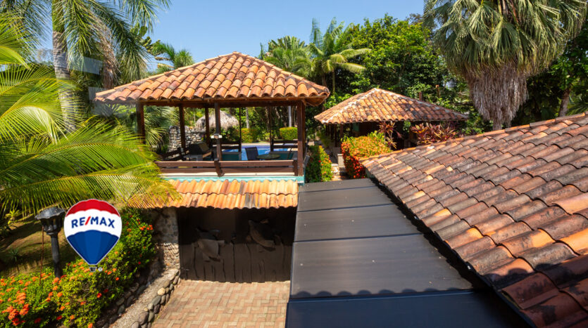 asa Cortez is the perfect home in paradise for entertaining or just enjoying the tropical climate of Costa Rica! Built on a thoughtfully landscaped half acre lot (2319 meters) filled with mature tropical plants, fruit trees and coconut palms this home features a huge swimming pool with cascading waterfall, multiple ranchos, one elevated over the garage and overlooking the pool and another with and outdoor kitchen featuring a brick pizza oven and full bathroom! There is also a shaded palapa seating area on the far side of the pool for those that want to kick back in the shade and enjoy a pina colada or smoothie.