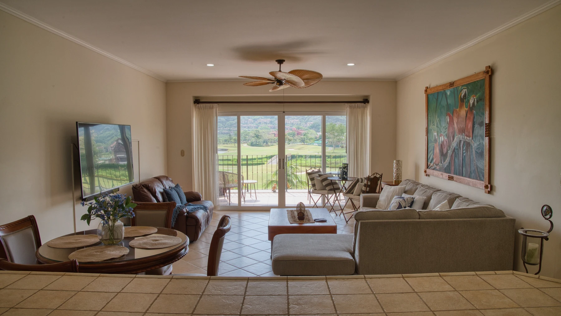 Los Suenos Ocean and Sunset View Condo is a third floor unit that looks out to the pool and Los Sueños’ stellar premises. With an area of 1670 ft2, the property has 3 bedrooms and 2 full baths. The kitchen features all-remodeled, top-of-the-line appliances, and connects intuitively to a bar area that serves as a transition towards a very large and comfortable living room. The three bedrooms branch off down the hallway to separate themselves from the unit, presenting an enviable sense of privacy. The exterior balcony has plenty of room to seat and gawk at the wondrous views of the Pacific.