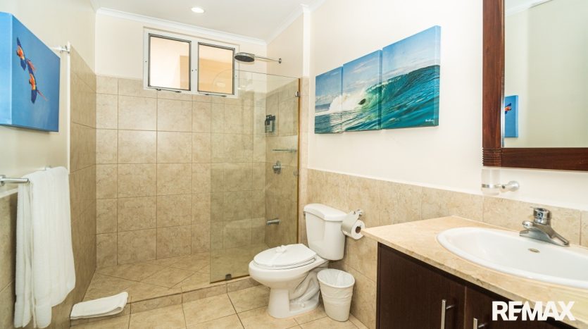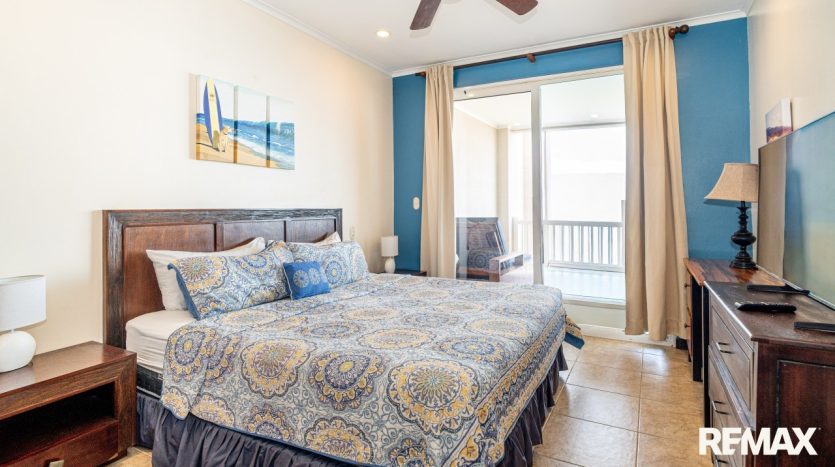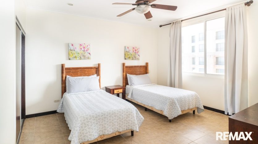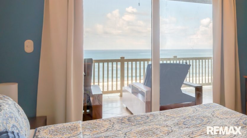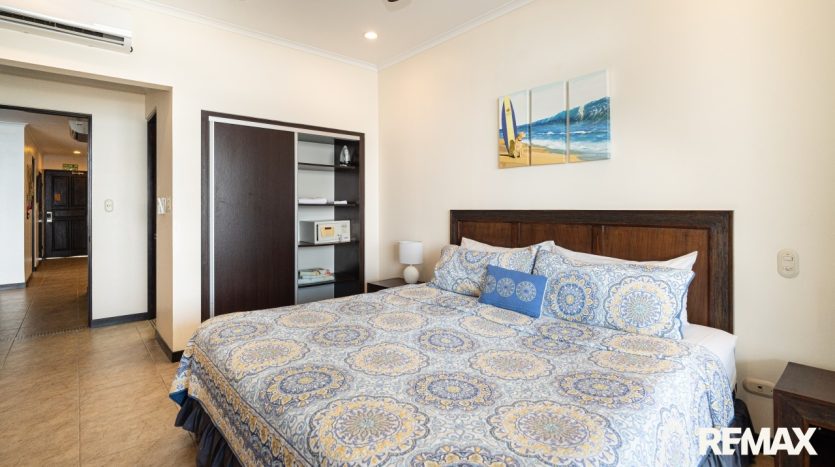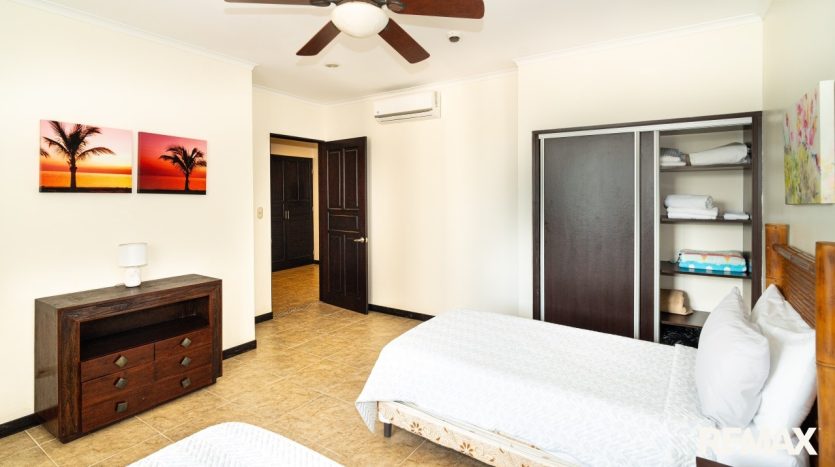 The master suite features a king size bed, ensuite bathroom, and direct access to the oceanfront balcony. The guest bedroom is thoughtfully positioned at the rear of the condo with two twin beds and tranquil views of the lush green hills that frame Jaco Beach.
